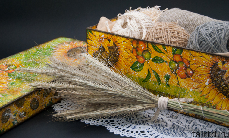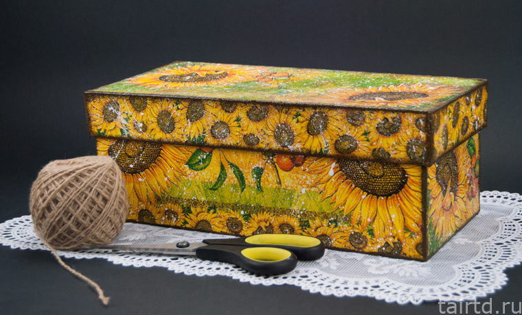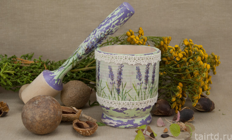 Лёгкая потертость, которая образуется в результате, не бросается в глаза, а декупаж, в принципе, тяготеет к винтажным эффектам. В завершении поделка покрывается лаком, и дефект нивелируется на общем фоне.