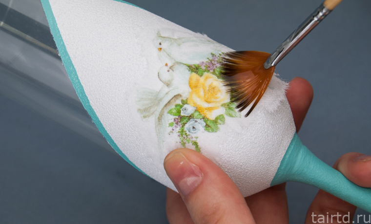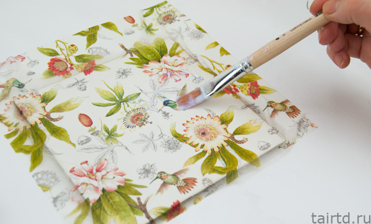 Закрепим мотив с помощью клея: действуем мягкой кисточкой от центра к краям мотива, стараясь избежать толстых мазков.