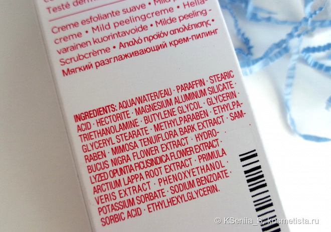 В составе средства природная глина и экстракт примулы (первоцвета), который обладает успокаивающим, смягчающим и антиоксидантным действием. Пилинг гипоаллергенен, подходит для всех типов кожи.