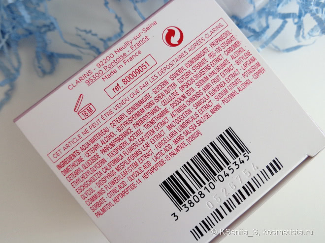 Свотч: Из полезностей в составе крема такие ингредиенты, как: экстракт миротамнуса — разглаживает первые морщины и поддерживает тонус кожи. Также это растение известно своей способностью сохранять влагу в коже и защищать ее от экстремальных температур и агрессивных воздействий внешней среды. Экстракт ворсянки обеспечивает увлажнение и сияние кожи, защищает и способствует восстановлению ее тонуса и энергии. Эксклюзивный защитный комплекс Clarins Anti-Pollution нового поколения.