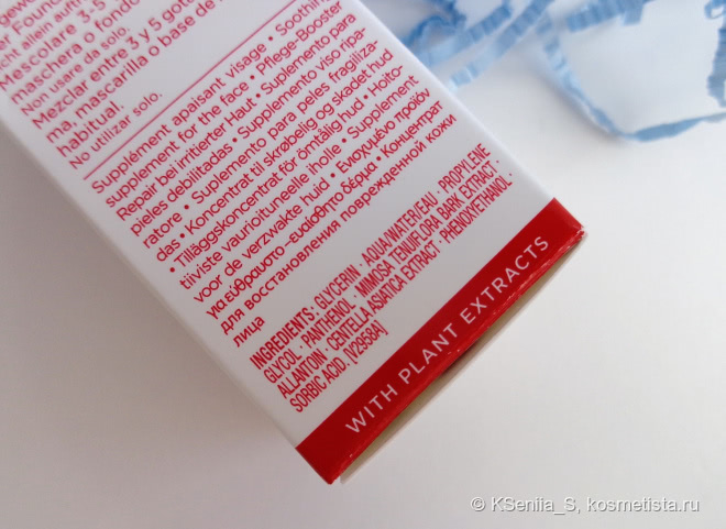 Полный состав: Уже после пары применений бустера шелушения проходят, кожа становится гладкая, увлажненная и напитанная. Питать её дальше необходимости попросту нет. Покраснения, которые для меня не редкость, появляются реже, следы от прыщей проходят быстрее. Производитель рекомендует использовать концентрат при солнечном ожоге, в условиях низких температур, для восстановления кожи после легких косметологических процедур и для предотвращения негативного воздействия от жесткой, соленой и хлорированной воды. Можно наносить его однократно, либо курсами в течение недели или месяца. Средство очень экономично, для поддержания эффекта напитанной кожи продолжаю использовать концентрат один раз в неделю, на ночь, и ей этого хватает за глаза. Чудесная вещь, для обезвоженной кожи находка — рекомендую!